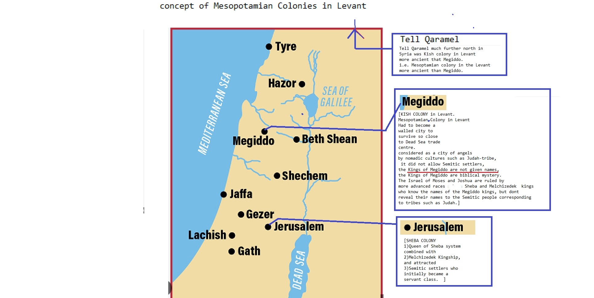 Possibility that Megiddo was mysterious Mesopotamian colony in Levant and that Megiddo kept surviving after the decline of Kish to Sumerian conquest, and survived into period of rise of the Old Babylonian Empire after the decline of Sumer ? Similar to how Tell Qaramel was a mysterious colony to the north, that western Archaeologists dont want to describe very much.Megiddo could be a Mesopotamian colony. Megiddo probably is connected to an ancient World trade Route from the Levant to Western Sahara to Isle of Man & Britain and Skara Brae, based upon study of Megalithic structures. So called Canaanites at Megiddo that had advanced knowledge of Iron - Judges 1:19 . [Similarities to how Carthage was an actual Canaanite colony(Natufian descendants) that kept surviving after the conquest of Tyre & Sidon.] To describe Megiddo as a Mesopotamian colony in the Levant could be a solution to the identity of Cushan-Rishathaim. Maybe he was a King of Megiddo. The way that Othniel succeeds Joshua. Joshua was fighting in Canaan not Mesopotamia. Then Othniel the successor to Joshua described as opposing Mesopotamian rulership seems contradictory. The Biblical jump from a war in the Levant to war in Mesopotamia seems contradictory.Maybe Othniel was opposing the rulership of Megiddo in the Levant.